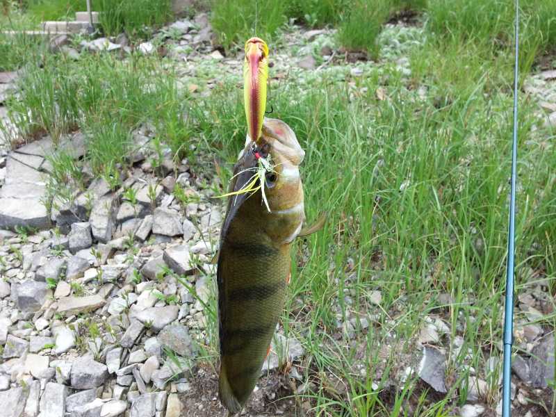 Дальше Вадим показывал мастер-класс по ловле на резинку Tioga, получив на стремнине в районе моста штук 10 поклевок и реализовав пару из них - одинарный крючок все-таки. Также очень удачно отработал воблер, разработанный специально для сильного течения (Вадим напомни название, у меня вылетело из головы). Он очень хорошо держит струю, и в том месте, где все другие приманки молчали, на эту модель Вадим вытянул ещё 2 рыбки.