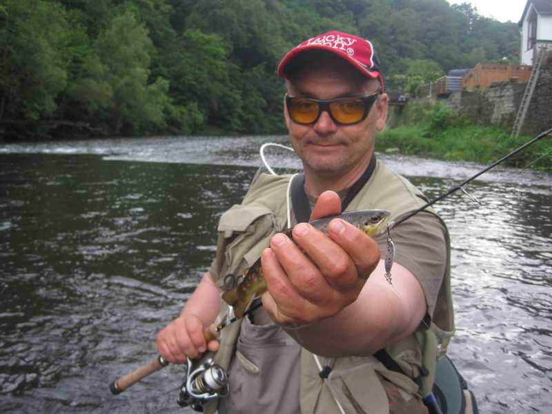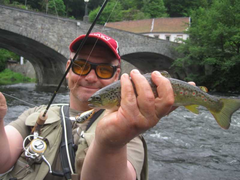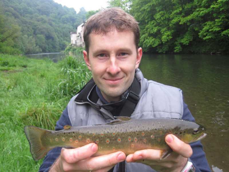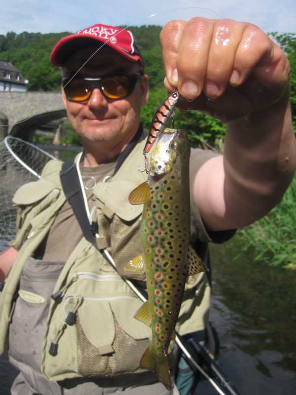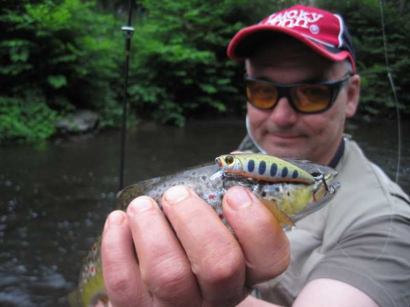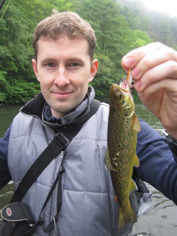 Не пройдя метров 50 Вадим умудрился из-за камешка на середине реки вытащить по очереди 2 форельки щенячего размера, которые были отправлены восвояси. Далее мне удалось соблазнить ещё две форельки с противоположного берега и одну с течения. Опять же отличился Crack Jack. Размеры пойманных рыб не превышали 35 сантиметров. К несчастью, через некоторое время мне удалось очень крепко засадить свой уловистый воблер на дерево на другом берегу, так что пришлось с ним попрощаться, оторвав шнур. После этого момента у меня была только одна поклевка на вертушку Super Vibrax, на которую до этого я ловил только окуней в Карелии.
